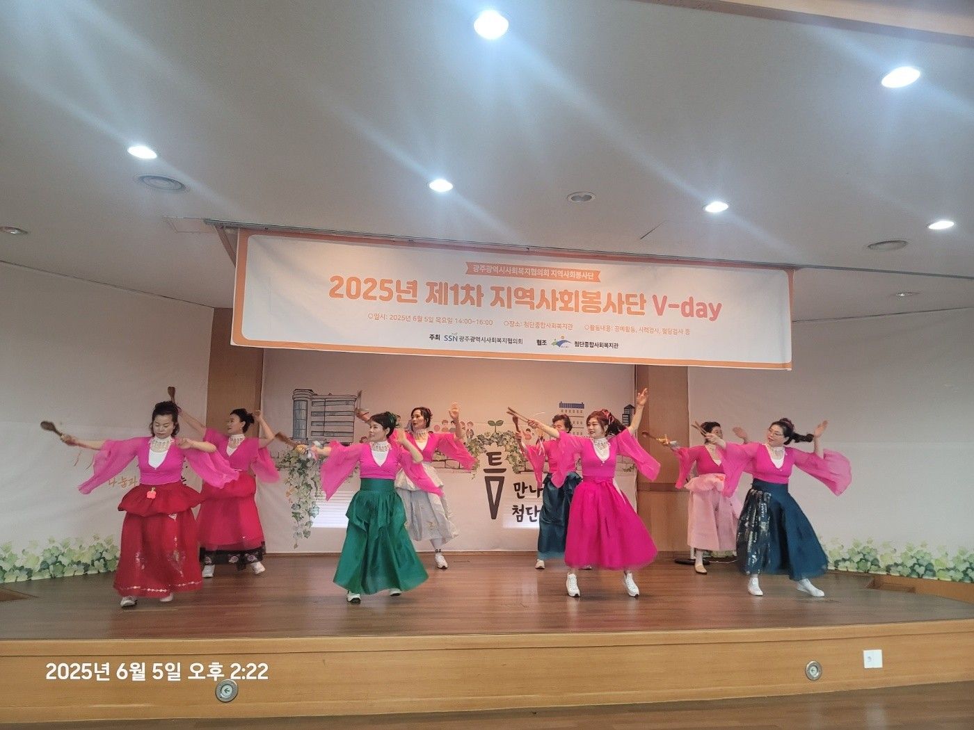 사업소식2025년 첨단종합사회복지관 지역사회봉사단 연계 나눔 행사2025년 06월 09일2025년 첨단종합사회복지관 지역사회봉사단 나눔 행사일시: 2025.6.5.(목)14:00~16:00장소: 첨단종합사회복지관 5층 대강당, 4층 새싹꿈터 등)내용: 지역사회봉사단 V-day의 재능 나눔활동(안마, 이미용, 네일아트, 문화공연 등)참여인원: 총 50명(복지관 회원 및 지역주민)목록으로